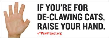 We all hate declawing in our home also. I have ‘The Paw Project” i my Netflix queue and look forward to seeing it. A Denver newspaper did an article on this same film recently. Her is the link. http://www.westword.com/2013-09-12/news/cat-declawing-animal-rights/ Neither of my cats are declawed and I my vet is adamantly opposed to it too. I would never go to a vet who did declawing in its practice. This inhumane and painful torture must be banned in the US and Canada.